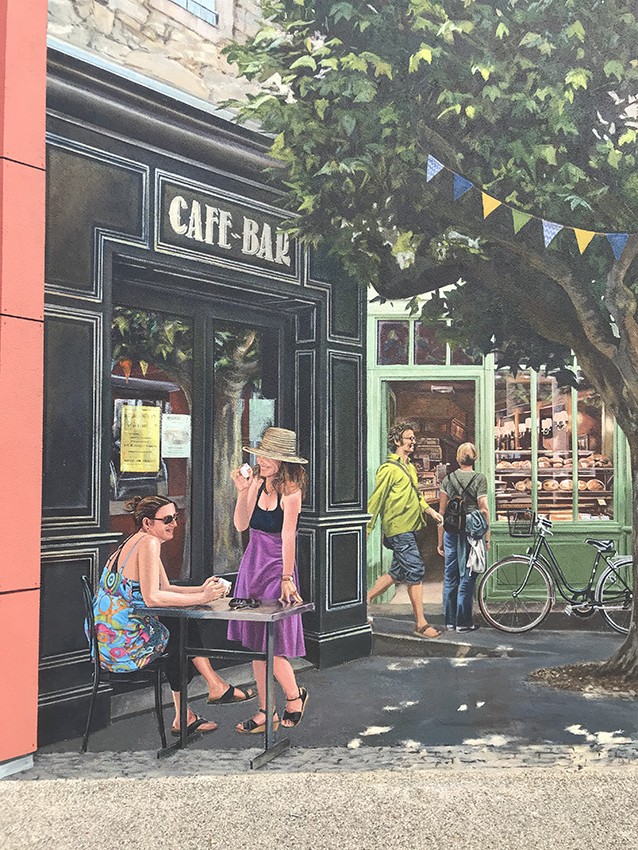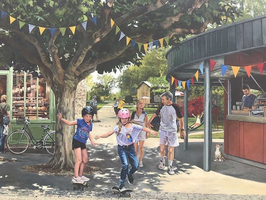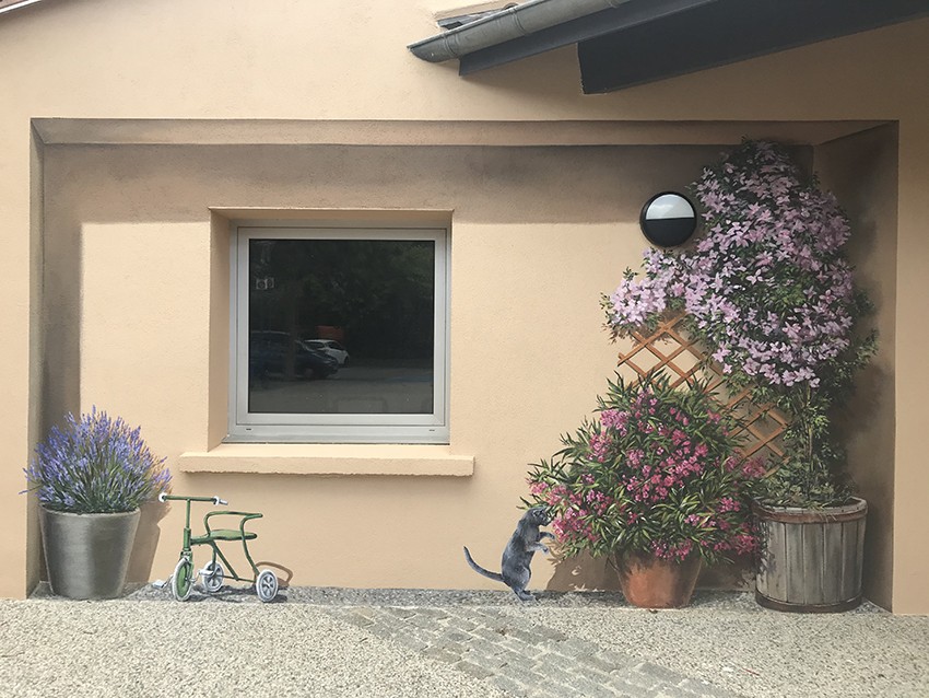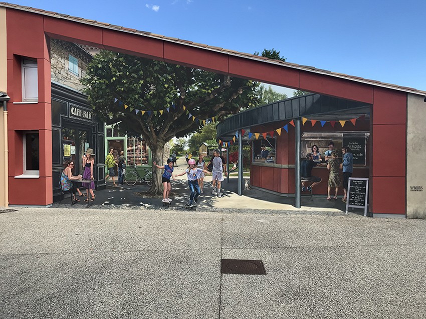 La greffe ayant pris, ce quartier neuf s’avère très vivant et convivial. La salle des fêtes, placée au centre présentait un mur aveugle très exposé aux regards. Nous avons illustré par le biais du trompe-l’œil, cette convivialité et ce bon vivre générés par le lieu. La demande se concentrait sur l’esprit de quartier, de fête, et l’idée d’offrir une scène intergénérationnelle vivante et joyeuse.