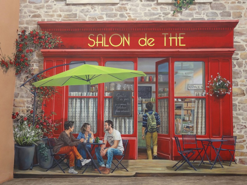 Cet emplacement, par son architecture atypique en plans multiples, représente un vrai défi de conception en matière de trompe-l’œil.Tous les décrochements de façade sont autant de problèmes posés, autant de possibilités. La première difficulté du trompe-l’œil étant le choix du point de vue, nous avons opté pour une solution plutôt consensuelle, un parti-pris qui permet au spectateur de supporter la vision de la peinture sous plusieurs angles.