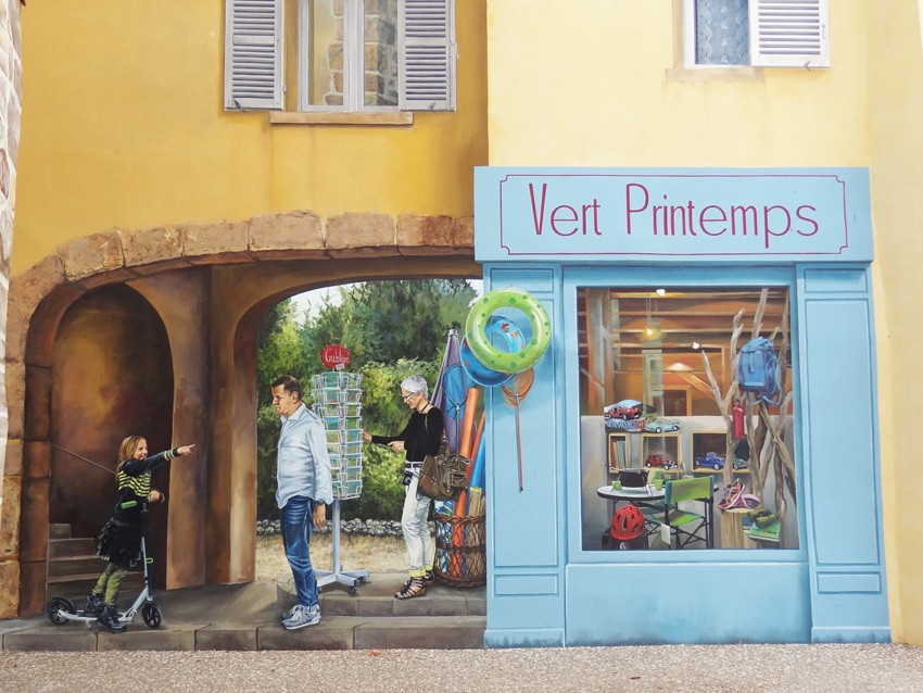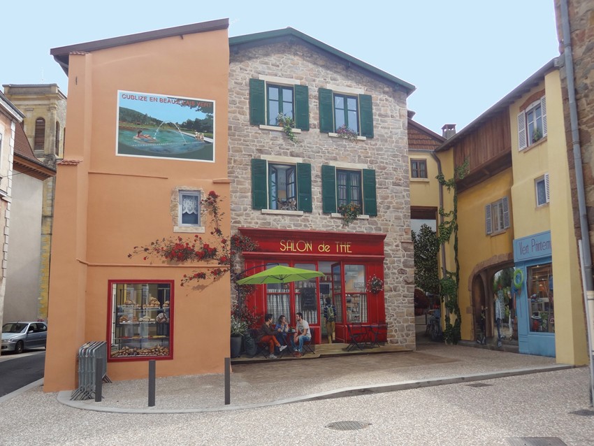 Ce projet est une demande de la ville de Cublize visant à remplacer une peinture réalisée plus de 20 ans auparavant et très détériorée. Pour faire suite à cette peinture d’artiste, très onirique, la municipalité a souhaité un visuel d’un esprit radicalement différent, un trompe-l’œil architectural totalement intégré à l’urbanisme local évoquant une place de village, pour inciter les passants à investir l’endroit.