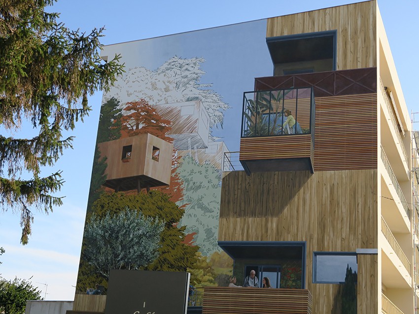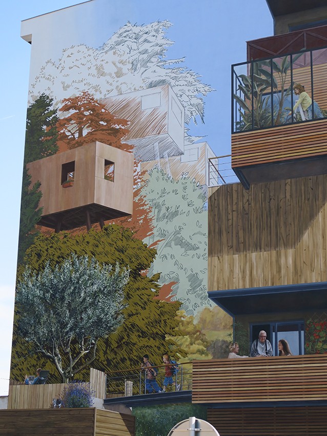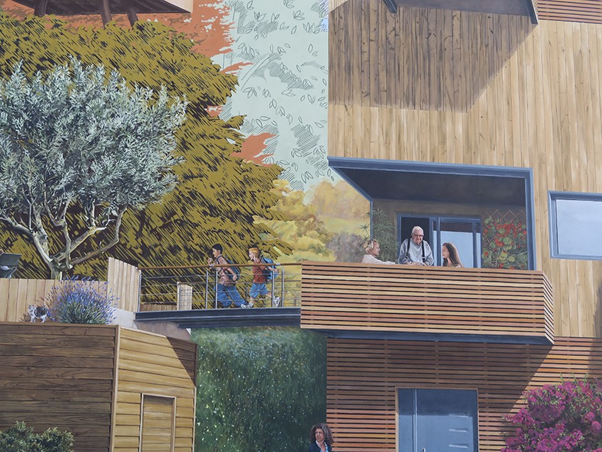 Le style pictural, en trompe-l’œil, prend des libertés et se mue en croquis paysagiste dans les hauteurs, pour apporter de la légèreté et une idée d’évolution en cours vers une ville nouvelle et plus verte.