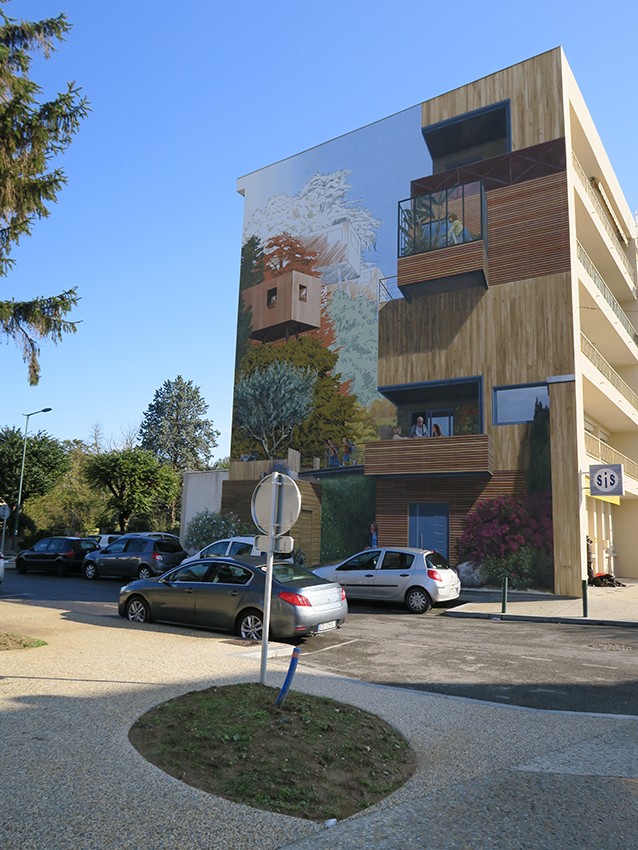 Dans le cadre de la restructuration et l’embellissement de l’Avenue de la République, au centre ville, la Mairie a souhaité faire réaliser un trompe-l’œil sur le pignon d’un immeuble des années 60, en harmonie avec un précédent projet réalisé en 2012 et placé dans son sillage.