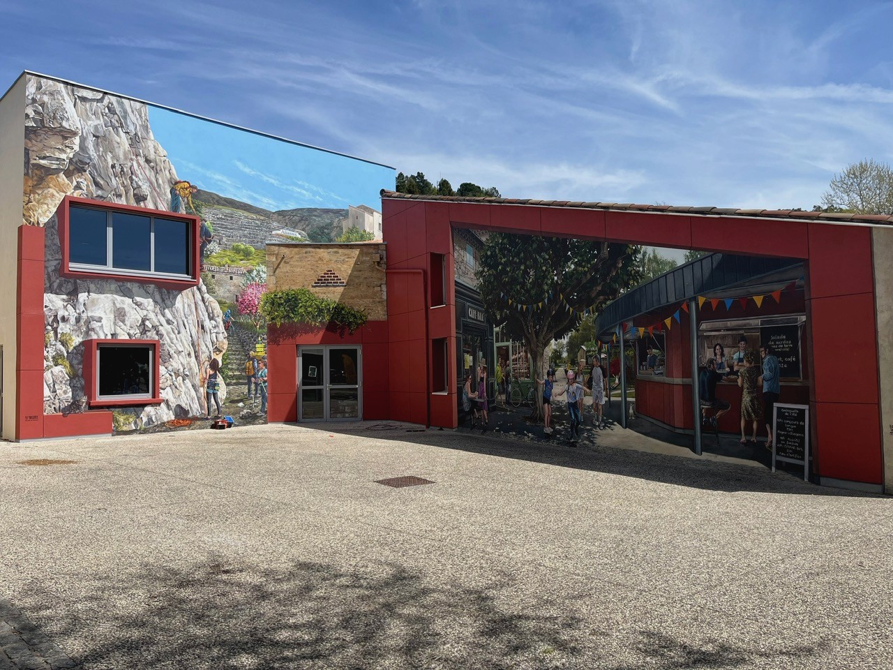 La greffe ayant pris, ce quartier neuf s’avère très vivant et convivial. La salle des fêtes, placée au centre présentait un mur aveugle très exposé aux regards. Nous avons illustré par le biais du trompe-l’œil, cette convivialité et ce bon vivre générés par le lieu. La demande se concentrait sur l’esprit de quartier, de fête, et l’idée d’offrir une scène intergénérationnelle vivante et joyeuse.