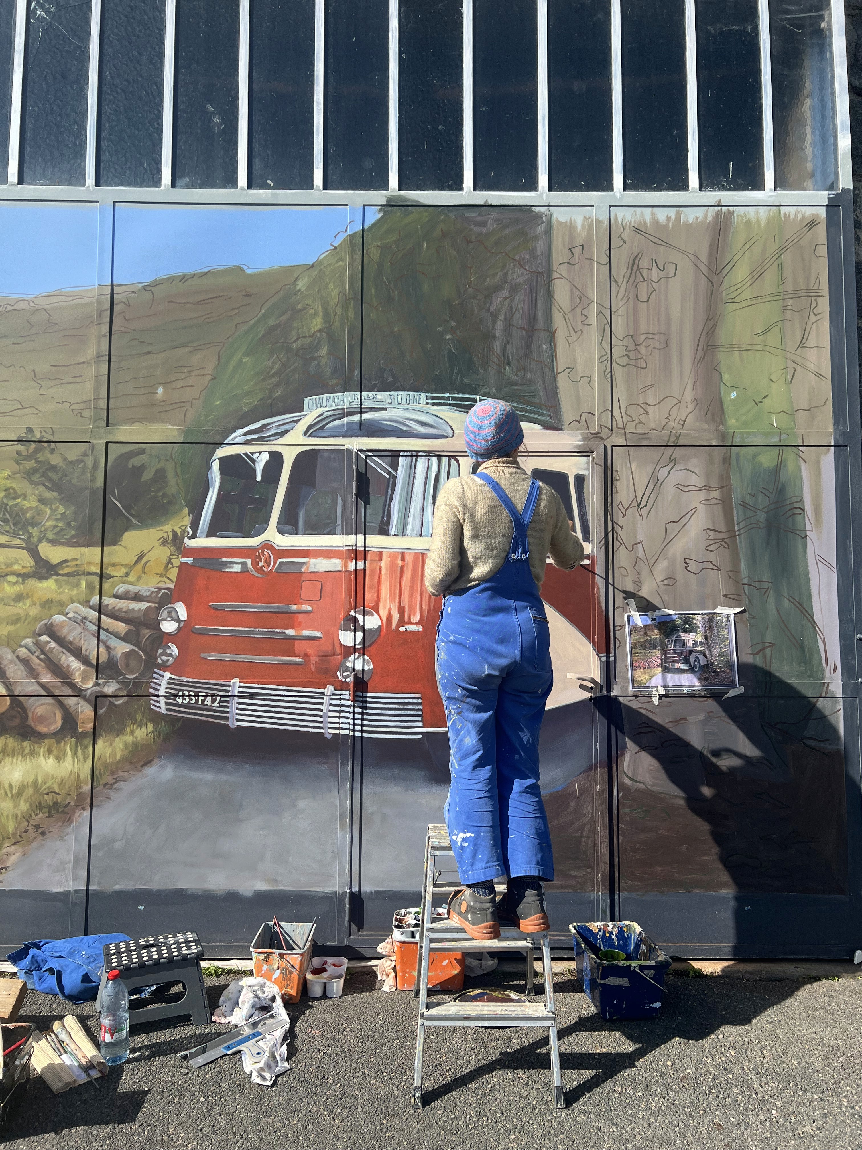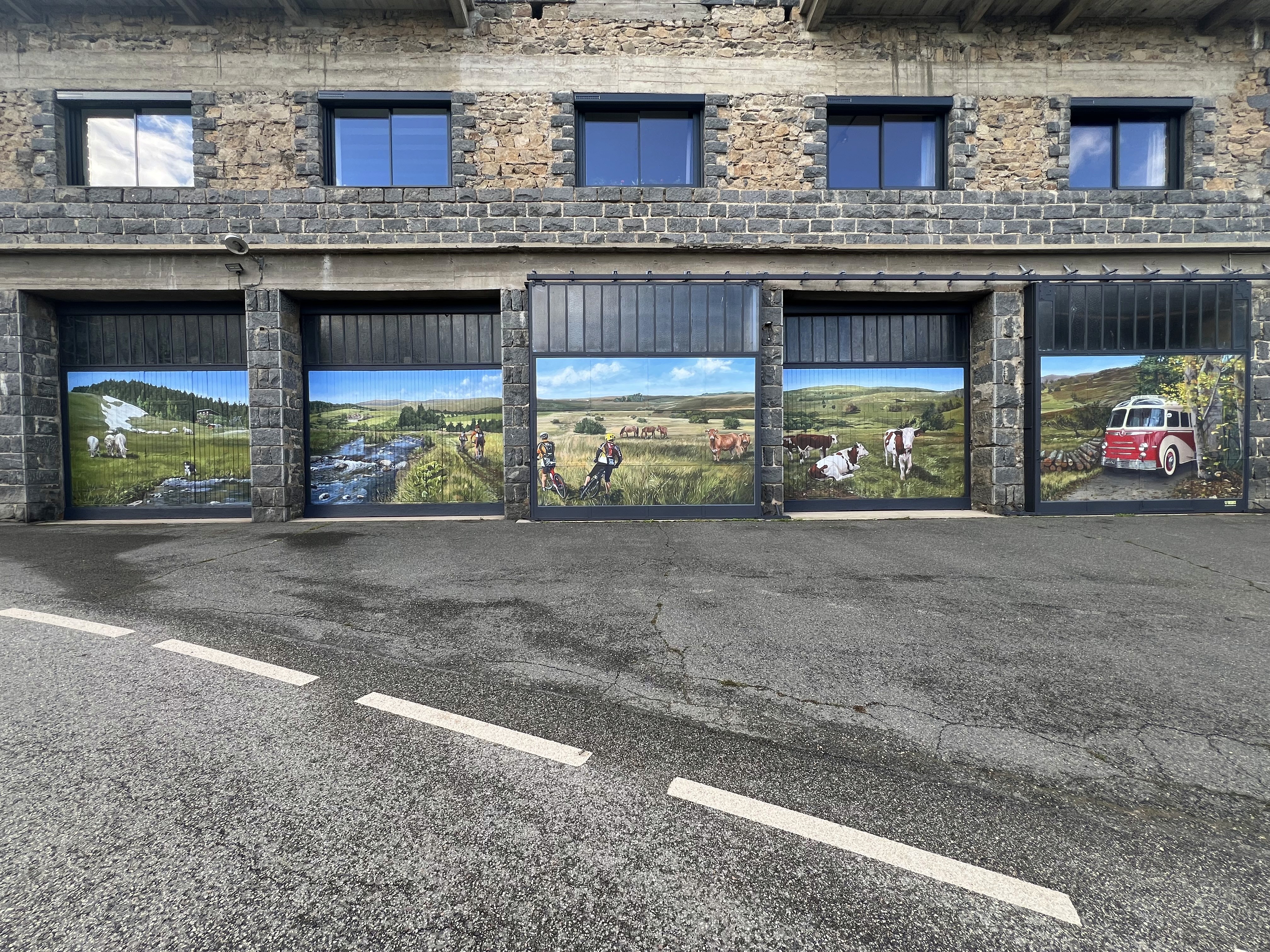 Station de ski, 5 habillages en trompe-l'oeil sur des anciens garages des bus Laurendon sur des portes en bois et en métal.