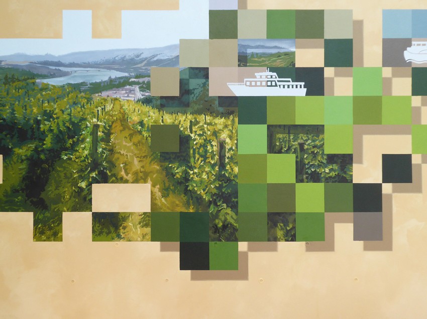 Si la partie droite offre un style traditionnel en accord avec l’architecture ancienne de la région, le côté gauche se positionne sur un terrain plus moderne, évoquant par son graphisme (dispositif de carrés rappelant l’organisation des pixels) et son sujet (paysage viticole ouvert sur le Rhône et l’horizon) le dynamisme de la ville, son ouverture sur le monde moderne et l’avenir.