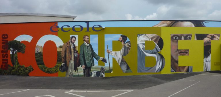 Suite à la réalisation de la peinture en hommage à Gustave Courbet sur le mur d’enceinte de l’école de Lunel-Viel en 2012, nous avons monté un deuxième projet sur le même thème, dans la cour de l’école, impliquant la totalité des élèves (11 classes du cp au cm2).