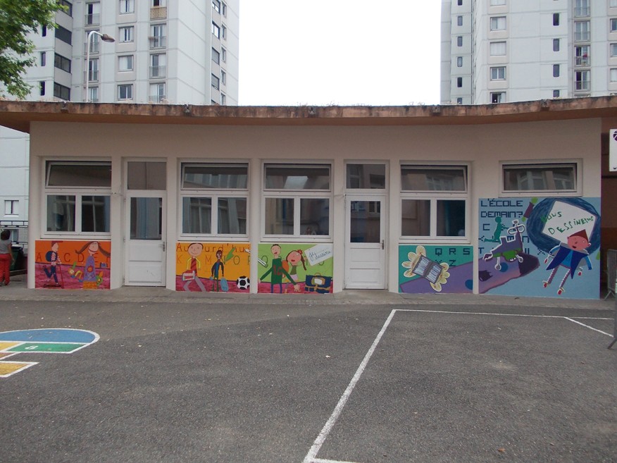 La totalité de la maquette a ensuite été agrandie et peinte par les élèves sur un mur de la cour de l’école au cours d’un chantier d’une semaine, au printemps, qui aura mis en ébullition toute l’école.