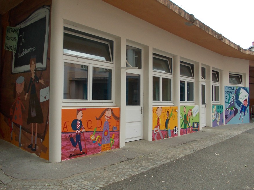 Le sujet choisi, « L’Ecole au Fil du Temps » a été amplement travaillé dans chacune des trois classes avant l’intervention de haut-les-MURS. Les classes, planchant respectivement sur l’école du passé, présent, et futur, ont rassemblé une iconographie qui a servi à un travail plastique des élèves avec l’intervenante de haut-les-MURS.