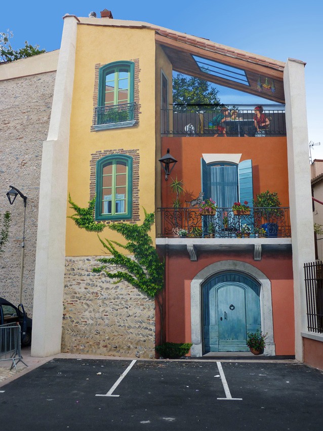 Dans le cadre d’une restructuration de l’espace urbain la municipalité a fait tomber des îlots de bâtiments détériorés, créant ainsi des parkings et des espaces de vie et de circulation piétonne. La démolition mettant à nu de nombreux pignons aveugles, il nous a été demandé d’animer deux façades en vis-à-vis sur une de ces nouvelles places du centre-ville.