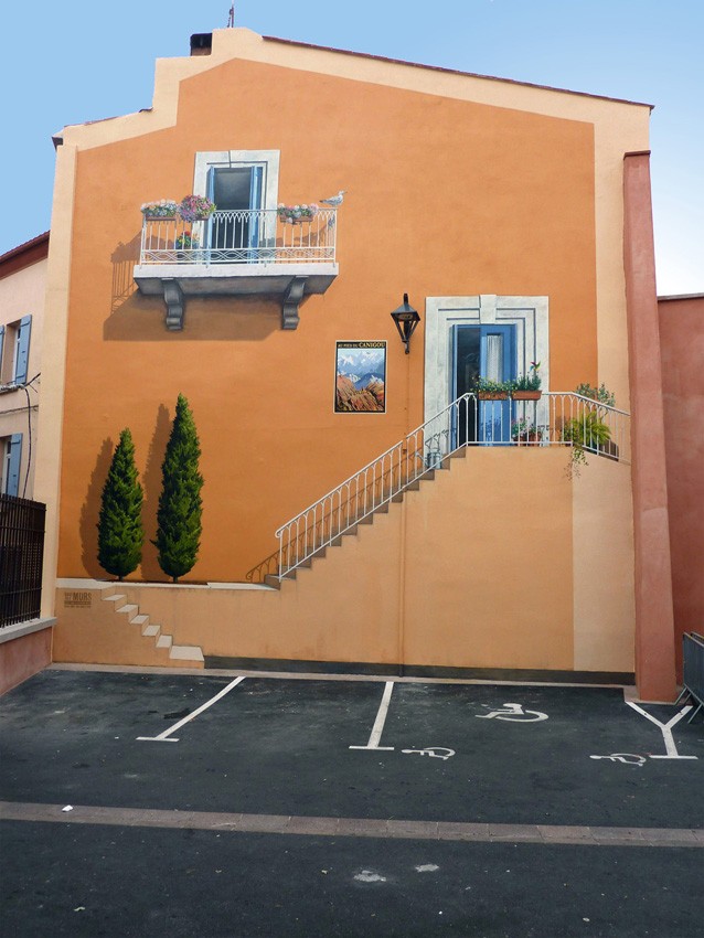 Dans le cadre d’une restructuration de l’espace urbain la municipalité a fait tomber des îlots de bâtiments détériorés, créant ainsi des parkings et des espaces de vie et de circulation piétonne. La démolition mettant à nu de nombreux pignons aveugles, il nous a été demandé d’animer deux façades en vis-à-vis sur une de ces nouvelles places du centre-ville.